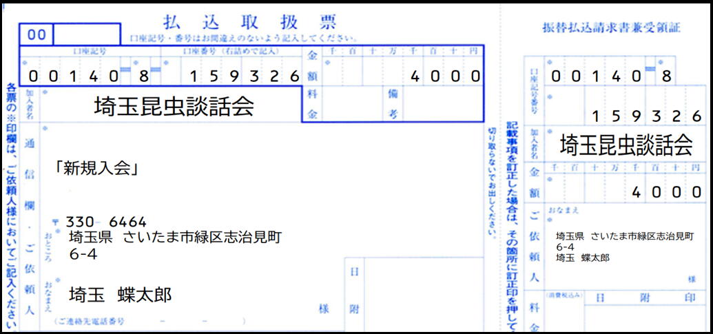 会費振込先 郵便振替 00140−8−159326 埼玉昆虫談話会 通信欄には おところ ・ おなまえ の他に 『新規入会』 とご記入ください |